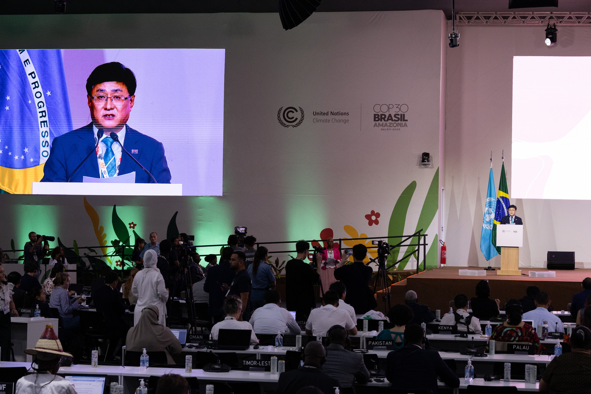 김성환 기후에너지환경부 장관이 17일(현지시간) 브라질 벨렝에서 열리고 있는 제30차 유엔기후변화협약당사국총회(COP30)에 참석하여 2035 NDC 목표에 대하여 고위급 국가발언을 하고 있다. 기후에너지환경부 김 장관은 “기후위기 대응은 운명공동체인 지구촌이 함께 해야 하는 모든 인류의 과제”임을 강조하며 “기후에너지환경부는 앞으로도 국제사회와 협력하며 전 지구적 탈탄소 전환에 적극 참여하여 대한민국이 탈탄소 녹색 문명을 만드는 모범국가가 될 수 있도록 노력하겠다”라고 밝혔다. 차승윤 기자 chasy99@segye.com