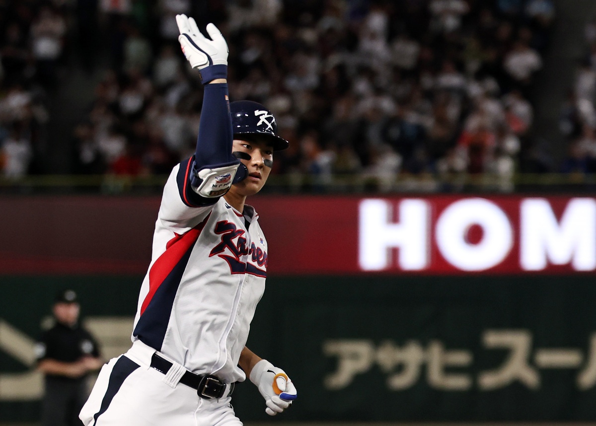 16일 일본 도쿄돔에서 열린 2025 K베이스볼 시리즈 대한민국과 일본의 평가전. 9회말 2사 주자없는 상황 김주원이 동점 솔로홈런을 쏘아올리고 있다. 연합뉴스 박찬호의 통산 성적은 1088경기 타율 0.266(3579타수 951안타) 23홈런 353타점 187도루 출루율 0.332, 장타율 0.328, OPS 0.660이다. 타격 능력만 놓고 보면 잘 봐야 리그 평균 정도다. 물론 최근 3년간 박찬호의 타격능력은 비약적으로 발전했다. 2023시즌에 생애 첫 3할 타율(0.301)을 기록했고, 2024시즌에도 타율 0.307로 2년 연속 3할 타율을 기록하며 생애 첫 골든글러브도 수상했다. 올해는 타율이 0.287로 떨어졌지만, 유격수 치고는 쏠쏠한 타격이었다.