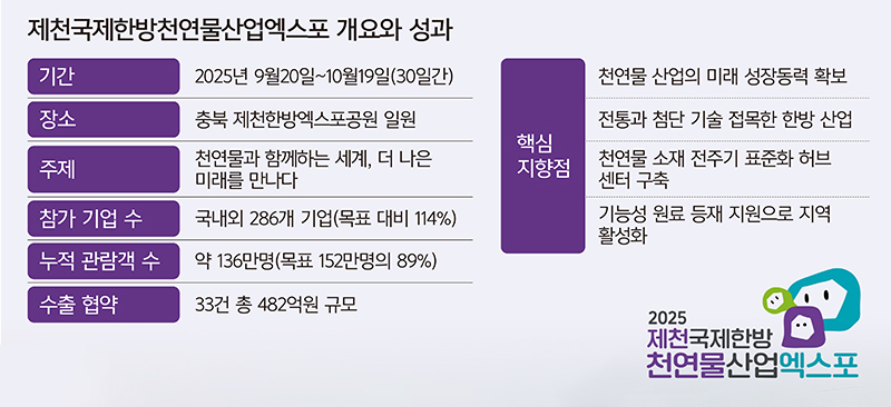 2025년 가을, ‘한방의 도시 제천’이 이제는 대한민국 ‘천연물 산업의 수도’로 부상했다. ‘천연물과 함께하는 세계, 더 나은 미래를 만나다’를 주제로 한 2025 제천국제한방천연물산업엑스포가 지난 9월20일 개막해 10월19일 폐막식을 끝으로 30일간의 여정을 마쳤다. 한방엑스포 조직위원회는 이번 엑스포는 제천이 대한민국 천연물 산업 중심 도시임을 선언하고 인공지능(AI) 기반의 미래로 꼽히는 천연물 산업 생태계 구축과 함께 세계 천연물 산업을 선도하는 ‘새로운 출발점’을 선포하는 의미를 담았다고 설명했다.