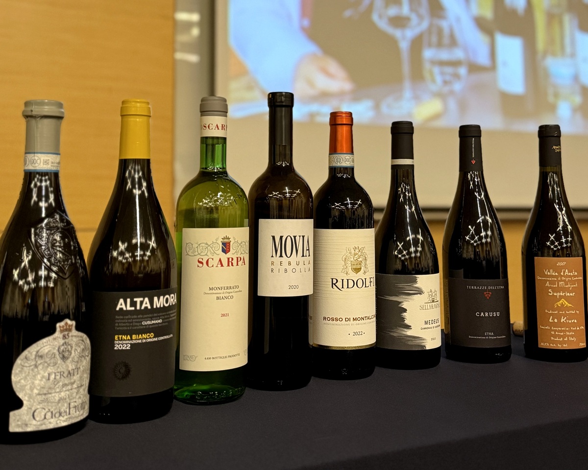 ‘이탈리아의 이그조틱한 품종’ 국제와인컨퍼런스 와인들. 이탈리아 북부 루가나(Lugana) DOC의 카데이 프라티 이 프라티 루가나(C? dei Frati I Frati Lugana/투루비아나), 에트나의 쿠수마노(Cusumano)의 알타 모라 에트나 비앙코(Alta Mora Etna Bianco/카리칸테), 에트나의 테라쩨 델레트나 에트나 로쏘 카루수(Terrazze dell’Etna Etna Rosso Carusu/네렐로 마스칼레제), 피에몬테의 스카르파 몬페라토 비앙코(Scarpa Monferrato Bianco/티모라쏘·Timorasso), 리돌피 로쏘 디 몬탈치노(Ridolfi Rosso di Montalcino/산지오베제), 사르데냐의 셀레 에 모스카 메데우스 로쏘(Selle e Mosca Medeus Rosso/칸노나우·Cannonau), 북서부 발레 다오스타 아르나드 몽조베 수페리오레(Valle d’Aosta Arnad Montjovet Sup?rieur/네비올로 클론 피코텐드로·Picotendro) 등입니다.