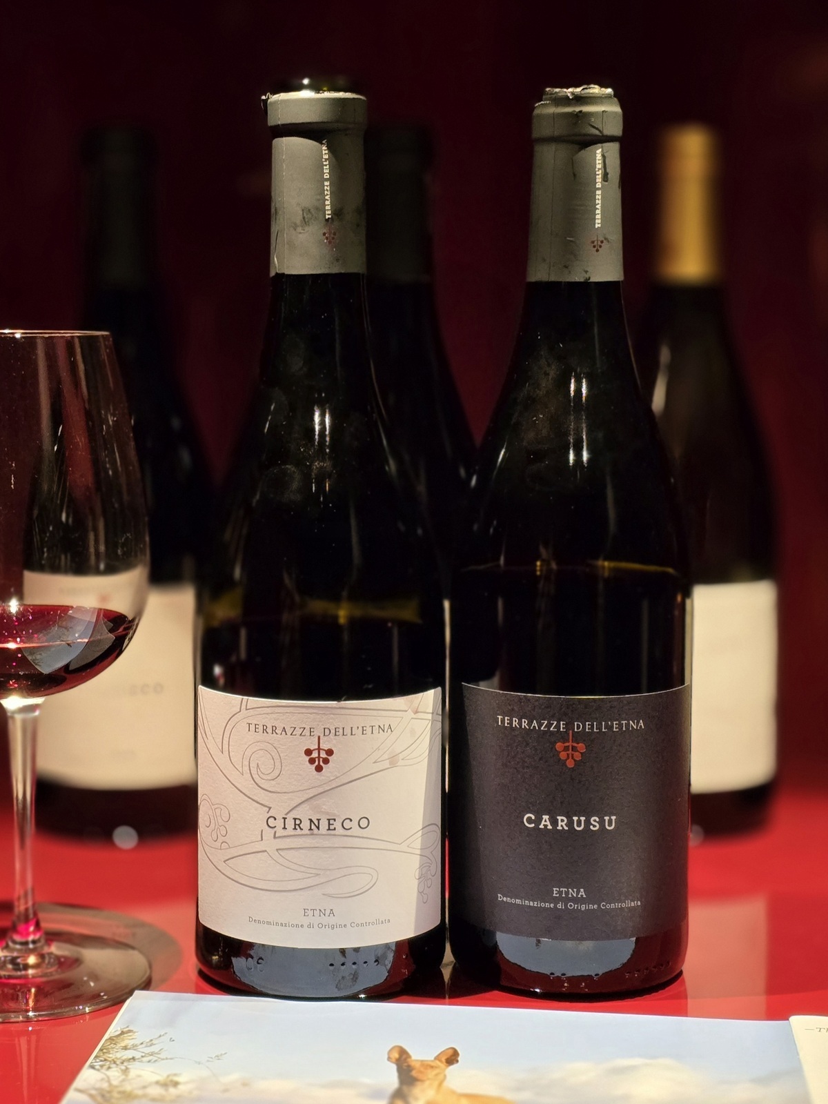 테라쩨 델라트나 치렌코와 카루수. 최현태 기자 ▶테라쩨 델레트나 에트나 로쏘 카루수 에트나 토착품종 네렐로 마스칼레제 80%, 네렐로 카푸치오 20%입니다. 군더더기 없이 포도품종의 캐릭터를 명확하게 잘 보여줍니다. 레드베리, 레드체리, 라즈베리, 자두, 석류의 붉은 과일향, 스파이시한 노트, 향나무가 어우러지고 화산 토양이 선사하는 미네랄도 잘 느껴집니다. 높은 해발고도 포도밭의 특징인 우아하고 날렵한 구조가 돋보이고 세련된 탄닌과 적당한 바디감을 지녔습니다.