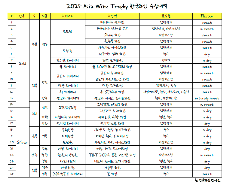 한국와인 수상 리스트. 심사에는 와인양조학자, 와인메이커, 와인 교육자, 소믈리에, 수입사 등 와인유통 관계자, 레스토랑·와인바 관계자, 와인전문기자 등 와인업계의 다양한 전문가들이 참여합니다. 올해는 30개국에서 와인 3389종이 출품됐고 21개국 심사위원 118명이 나흘동안 까다로운 심사과정을 통해 총 1017종을 수상 와인으로 선정했습니다. 그랑골드 40종, 골드 924종 실버 53종입니다. 수입 와인은 122종(그랑골드 9, 골드 103, 실버 14)이 선정됐고 한국 와인은 25종(골드 14, 실버 11)입니다. 한국 와인은 오드린 베베마루, 도라원 샤토미소 앰버 와인, 갈기산 와이너리 포엠 로제와인, 고도리 와이너리 로제와인, 젤코바 와이너리 아이스 화이트, 그린영농조합 그랑꼬또 로제와인 등이 골드를 받았습니다.