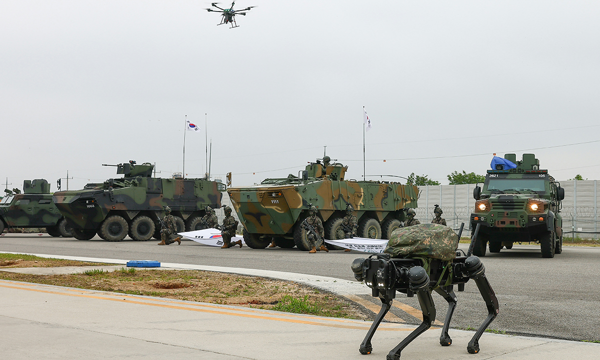 육군의 차륜형장갑차와 다족로봇이 전시되어 있다. 세계일보 자료사진 우크라이나 전쟁에서 위력이 입증된 자폭드론은 미사일이나 로켓으로 공격하기에는 가성비가 맞지 않는 표적을 타격할 수 있다. 대대급 이하 소부대에는 소형 드론들이 다수 배치된다. 보병대대에는 소형 대인·대장갑 자폭드론과 초소형 자폭드론, 대대급 정찰드론-Ⅱ를 배치하고, 특수전부대에는 소형 특수작전자폭드론과 초소형 정찰드론을 지급할 계획이다.