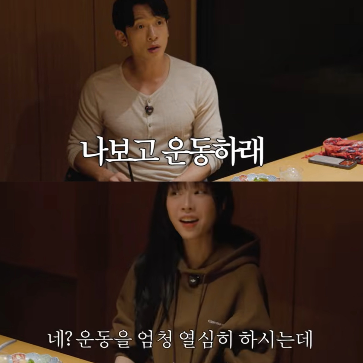 비와 먹방 유튜버 쯔양. 시즌비시즌 이어 비는 그에게 건강검진을 하는지, 결과가 괜찮게 나왔는지 물었다. 쯔양은 엄지를 세우고 좋게 나왔다고 표현했지만, 비는 “나 건강검진 받았다? (그런데) 고지혈증이 있대. 나보고 운동하래”라고 당황했던 심정을 드러냈다. 듣던 쯔양은 “네? 운동을 엄청 열심히 하시는데”라며 믿을 수 없다는 듯이 웃었다. 이에 불구하고 비는 “유산소 운동을 많이 하라더라”고 구체적인 처방을 얘기했다. 분위기가 숙연해지자 비는 “내가 말을 너무 많이 했지”라며 급하게 화제를 전환했다.
