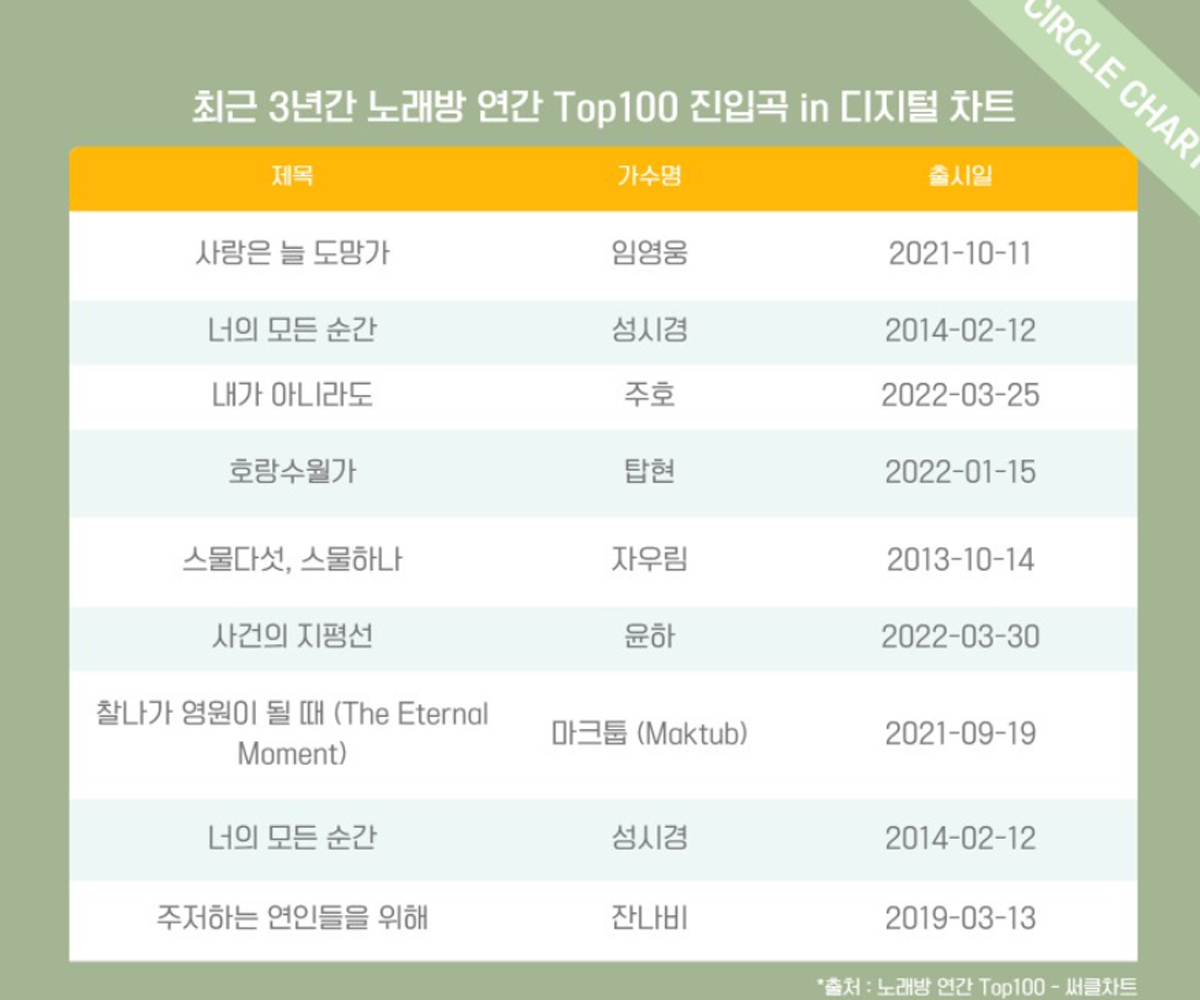 21일 써클차트에 따르면 최근 3년 동안 노래방 연간차트 톱100에 꾸준히 이름을 올린 곡은 총 50곡이다.