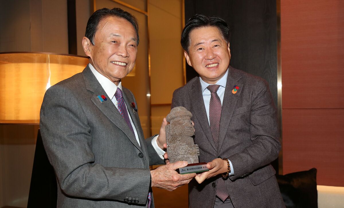 아소 다로 회장은 2007년 3월 일본 외무상 재임 당시 한중일 외무장관 회담을 위해 제주를 방문한 인연이 있다.