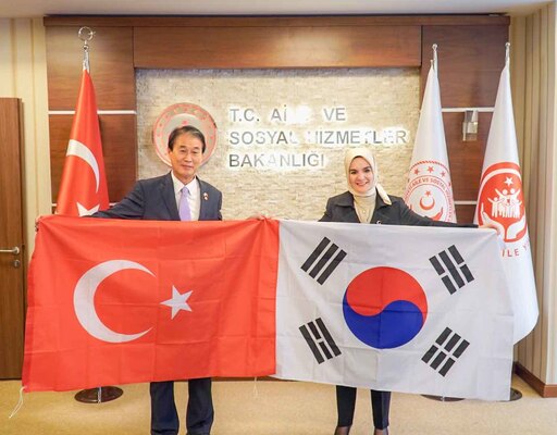 24일(현지시간) 튀르키예 수도 앙카라에서 만난 권오을 국가보훈부 장관(왼쪽)과 마히누르 외즈데미르 괵타스 튀르키예 가족사회부 장관이 각각 상대방 국가의 국기를 펼쳐 든 채 기념촬영을 하고 있다. 국가보훈부 제공 6·25 전란 때 튀르키예는 미국(178만여명), 영국(5만6000여명), 캐나다(2만6000여명) 다음으로 많은 연인원 2만1000여명의 병력을 한반도에 보내 한국을 도왔다. 유엔 안전보장이사회(안보리) 5대 상임이사국 중 하나로 유럽의 강대국인 프랑스(3400여명)보다 훨씬 많다. 6·25 기간 튀르키예의 군대만 한국에 힘이 된 것이 아니다. 오늘날 용산 전쟁기념관 3층 튀르키예 전시실에는 튀르키예어로 ‘우리는 하나다’라고 적힌 튀르키예 국기가 전시돼 있다. 당시 튀르키예 갈라타사라이 고교 학생들이 자국 장병을 응원한다며 손가락에서 흘린 피로 글씨를 쓰고 저마다 손도장도 찍었다고 한다. 참으로 눈시울이 붉어지는 대목이 아닐 수 없다.