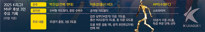 프로축구 K리그1이 30일 열리는 최종 38라운드를 끝으로 2025시즌을 마무리하는 가운데, 올 시즌 그라운드에서 가장 빛나는 선수에게 주어지는 최우수선수(MVP)의 향방에도 관심이 쏠린다. MVP 최종 후보에 오른 박진섭(전북 현대)과 싸박(수원FC), 이동경(울산 HD)이 저마다의 강점을 앞세워 생애 첫 MVP 수상에 도전한다.