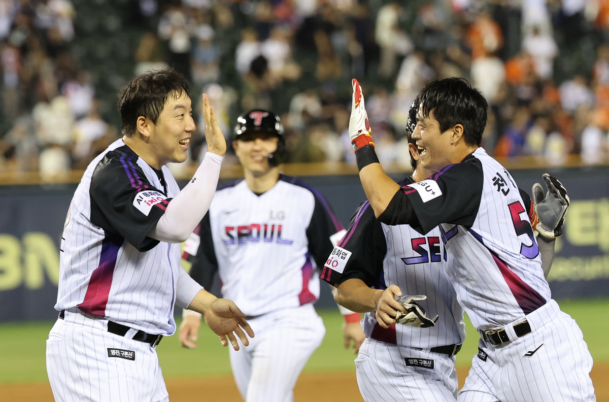지난 8월 8일 서울 잠실야구장에서 열린 프로야구 한화 이글스와 LG 트윈스의 경기. 10회말 1사 만루 LG 천성호가 끝내기 안타를 친 뒤 김현수와 하이파이브하고 있다. 연합뉴스
