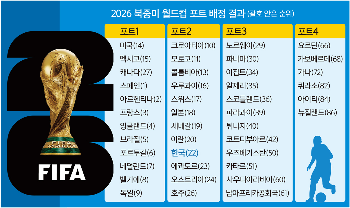 게다가 유럽축구연맹(UEFA) 플레이오프(PO) 승자 4팀과 FIFA 대륙 간 PO 승자 2팀을 합쳐 마지막으로 본선 출전권을 따내는 6개 팀은 포트4에 들어간다. UEFA PO를 뚫어낸 유럽의 강호가 포트4에서 한국과 같은 조에 속하게 되면 포트2 사수를 통한 유리한 점이 상당 부분 희석될 수밖에 없다. 포트1에는 공동 개최국 캐나다, 멕시코, 미국이 자동 배치됐고, FIFA 랭킹 1위 스페인부터 아르헨티나, 프랑스, 영국, 브라질, 포르투갈, 네덜란드, 벨기에, 9위 독일까지 차례로 포함됐다. 북중미 월드컵 본선 조 추첨은 다음 달 6일 오전 미국 워싱턴 케네디센터에서 진행된다.