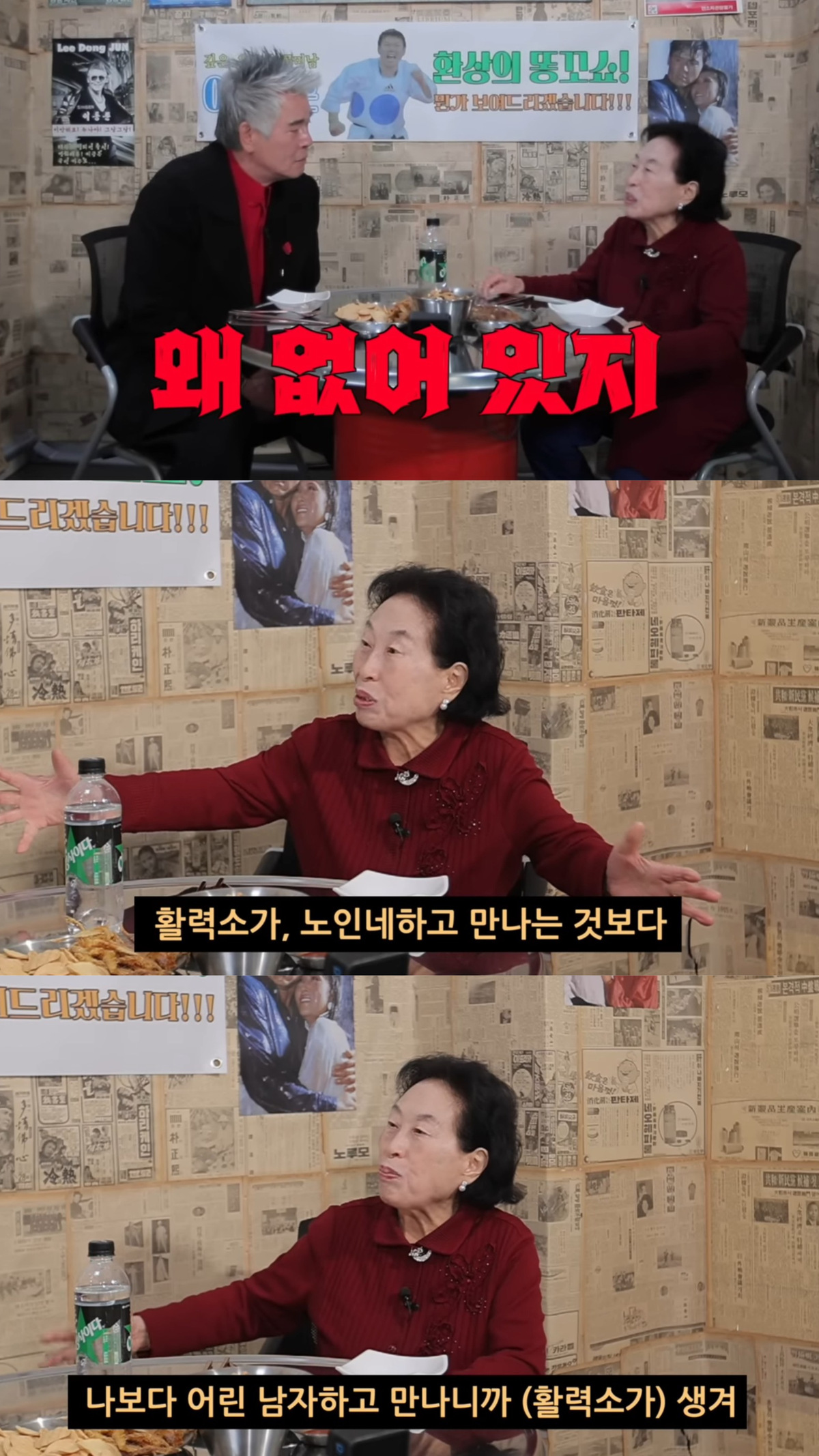 또, 전원주는 “늙은이들이 나를 좋아한다”면서 “자기 또래니까. 늙은이들이 내가 나가면 전부 박수 친다. 그게 사는 맛이다. 지금 내가 늙었다는 기분이 안 든다. 지금도 이렇게 동준이 같은 멋있는 후배가 있으면 아직도 가슴이 두근두근하다”라고 말했다.