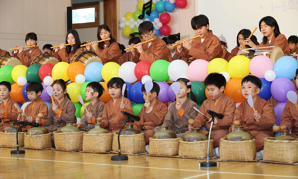 28일 제주 성읍초등학교에서 열린 벨롱벨롱 꿈자랑 발표회에서 전교생 58명이 모여 전통음악을 연주하고 있다. 서울시교육청 제공 서울시교육청은 전남, 전북, 강원, 제주에 이어 내년엔 인천으로 프로그램을 확대할 예정이다. 정근식 서울시교육감은 “현재 6개월 정도 지원 가능한 예산을 1년 단위로 늘리고, 매년 1000명 정도가 유학을 경험할 수 있게 확장하는 방안을 검토 중”이라고 밝혔다. 제주=차승윤 기자 chasy99@segye.com