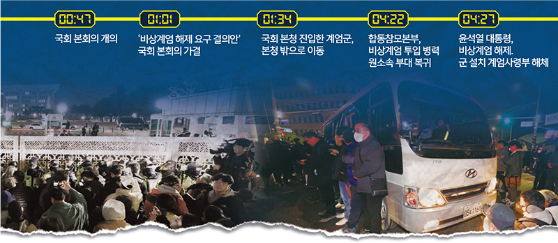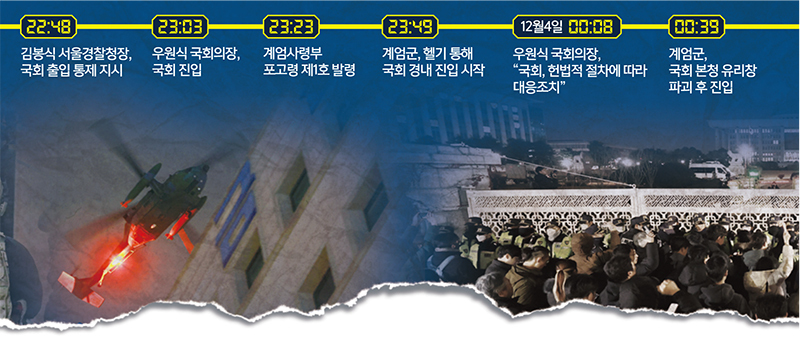 2024년 12월3일. 국민들은 해가 진 이후에도 평소와 다르지 않은 일상을 이어가고 있었다. 그러나 오후 10시23분 윤석열 전 대통령이 대국민 발표를 통해 비상계엄을 선포하면서 국가 운영 체계는 급격히 비상 국면으로 전환됐다. 국민들은 밤새 자발적으로 국회로 모여들고 각자의 자리에서 대응하며 민주주의의 중대한 위기를 막기 위해 총력을 기울였고, 결국 위기의 확산을 저지했다. ◆‘현실’이 된 계엄…기록의 시작