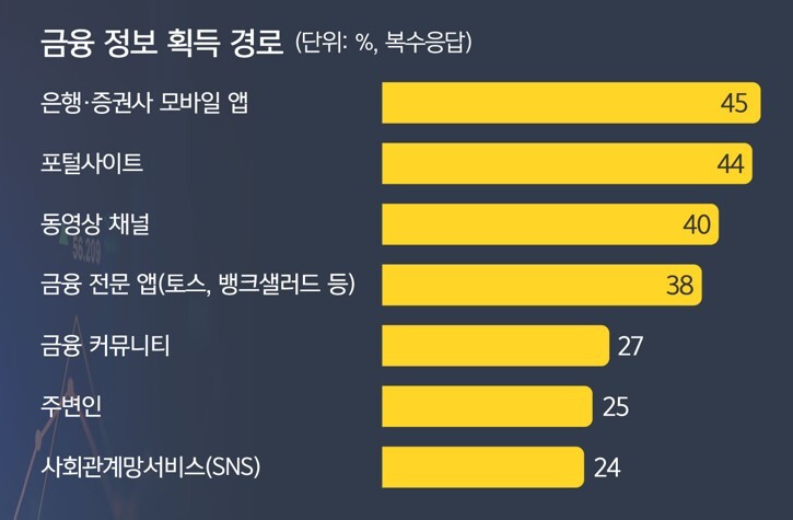 CJ메조미디어 설문조사에 따르면 금융소비자들은 금융 정보를 얻기 위해 은행·증권사 모바일 앱(45%), 토스·뱅크샐러드 등 금융 전문 앱(38%)만큼이나 동영상 채널(40%)을 사용하는 것으로 나타났다. 특히 동영상 채널은 젊은 세대만 주목할 것이라는 선입견과 달리 40대(40%)나 50대(38%)도 대부분 사용하고 있었다. 물론 20대(40%), 30대(45%)의 이용률도 높았다. 사회관계망서비스(SNS)에서 금융 정보를 얻는다고 한 응답은 24%로 비교적 적었지만, 20대의 경우 그 비율이 40%까지 올라간다. 동영상 채널이자 SNS의 특징도 갖춘 유튜브는 전 세대를 아울러 놓쳐선 안 될 소통 창구인 것이다.