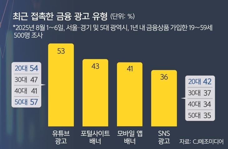 유튜브 채널을 통한 광고 콘텐츠로의 유입도 무시할 수 없는 효과다. 같은 조사에서 소비자들은 주로 유튜브(53%)를 통해 금융광고를 접하며, 배너 광고(43%)를 통해 노출되는 비율도 높게 나타났다. 응답자의 41%는 최근 3개월 내 디지털 광고를 보고 금융상품에 가입한 적이 있다고 답했다.