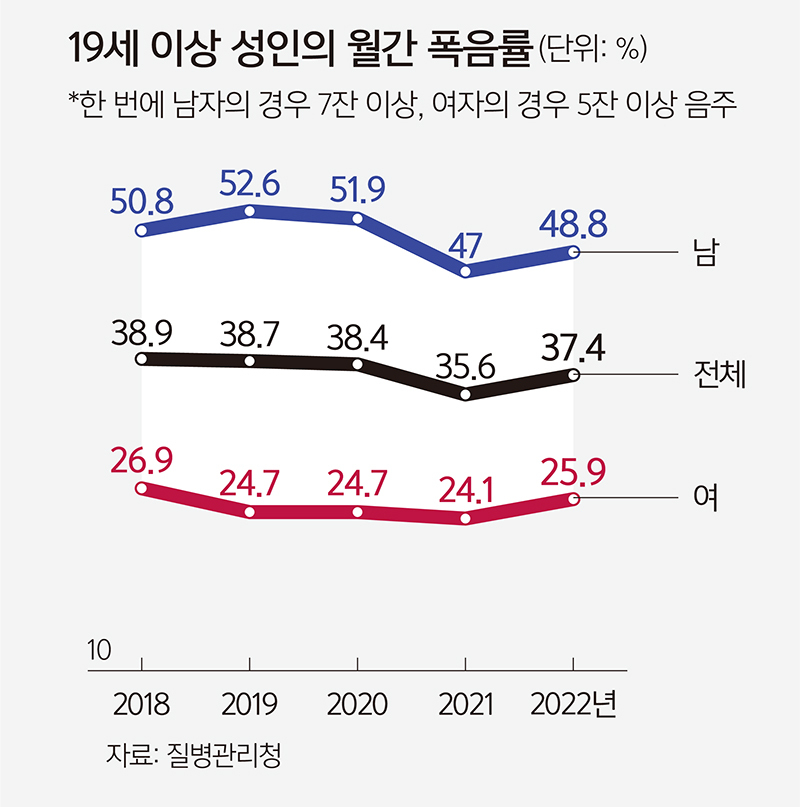 지난달 30일 한국건강증진개발원의 ‘2024 알코올 통계자료집’에 따르면 19세 이상 성인의 월간 폭음률(한 번의 술자리에서 남성 7잔·여성 5잔 이상 음주)은 2018년 38.9%, 2019년 38.7%, 2020년 38.4%, 2021년 35.6%, 2022년 37.4%로 최근 5년 동안 평균 38% 수준을 오르내렸다. 또 성인 남성 두 명 중 한 명, 여성 네 명 중 한 명꼴로 월 1회 이상 폭음을 하는 것으로 나타났다.