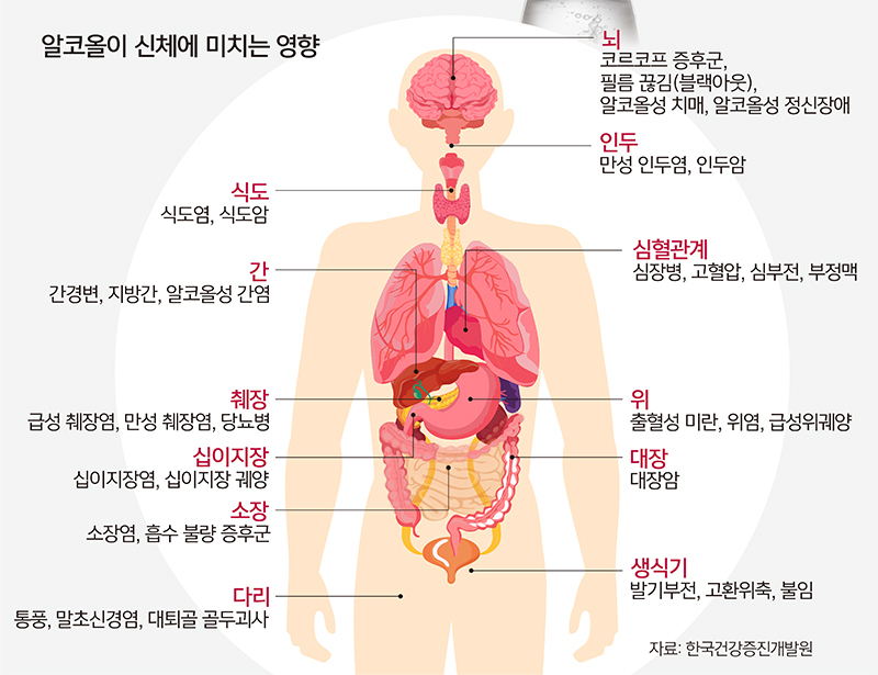 과도한 음주는 간의 지방 합성을 촉진하고 정상적인 에너지 대사를 방해해 지방간을 유발한다. 정상 간에는 약 5% 정도만 지방이 존재하지만 이보다 많은 지방이 축적되면 지방간이 된다. 초기 알코올성 지방간은 금주하면 4∼6주 후 간 기능이 정상으로 회복될 수 있다. 그러나 이 상태에서도 계속 술을 마시면 20∼30%는 알코올성 간염으로 진행될 수 있다. 이때는 무력감과 피로감이 심해지고 발열, 오심·구토, 식욕부진, 황달 등의 증상이 나타날 수 있다. 알코올성 간염 환자가 음주를 지속하면 간섬유화가 진행돼 간이 딱딱해지고 간 기능이 소실되는 간경변증으로 이어질 위험이 38∼56%에 달한다. 특히 간경변증 환자 중 7∼16%는 간암으로 진행하는 것으로 알려져 있어 각별한 주의가 필요하다.