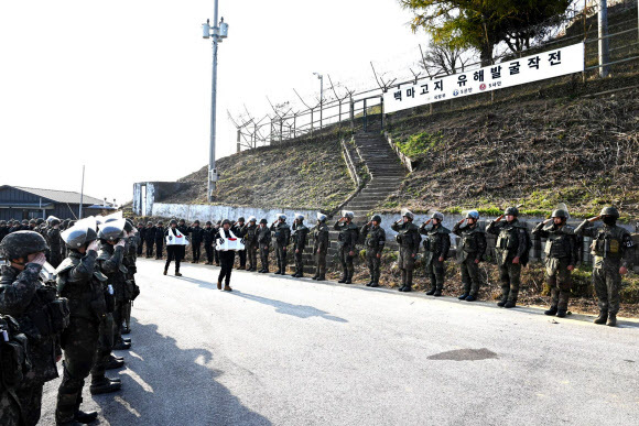 남북은 지난 2018년에 체결한 '9·19 군사합의'를 통해 강원도 철원지역 DMZ에서 6·25 전사자 유해를 함께 발굴하기로 했으나, 이후 북측이 유해 발굴에 나서지 않아 남측 단독으로 DMZ 유해 발굴에 나서 화살머리고지에서 2019년 4월부터 2021년 6월까지 유해 424구와 유품10만1천816점을, 백마고지에서는 2021년 9월부터 2022년 11월까지 유해 67구와 유품 1만5천670점을 각각 발굴한 바 있다. (사진=국방부 제공)