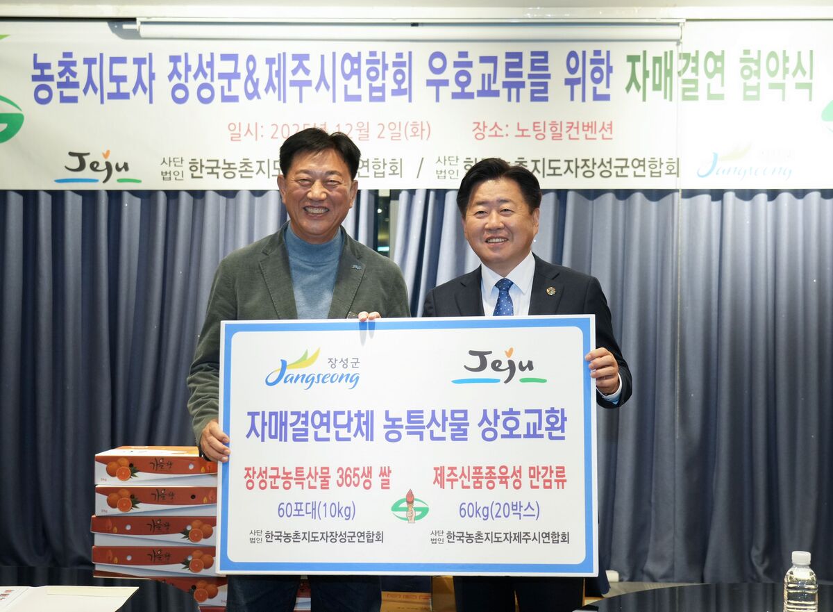 전날 제주시 노팅힐컨벤션에서 열린 교류 행사에는 오영훈 제주도지사와 김한종 장성군수를 비롯해 양 지역 농촌지도자 회원 50여 명이 참석했다. ㈔한국농촌지도자 제주시연합회와 장성군연합회가 공동 주관했다.