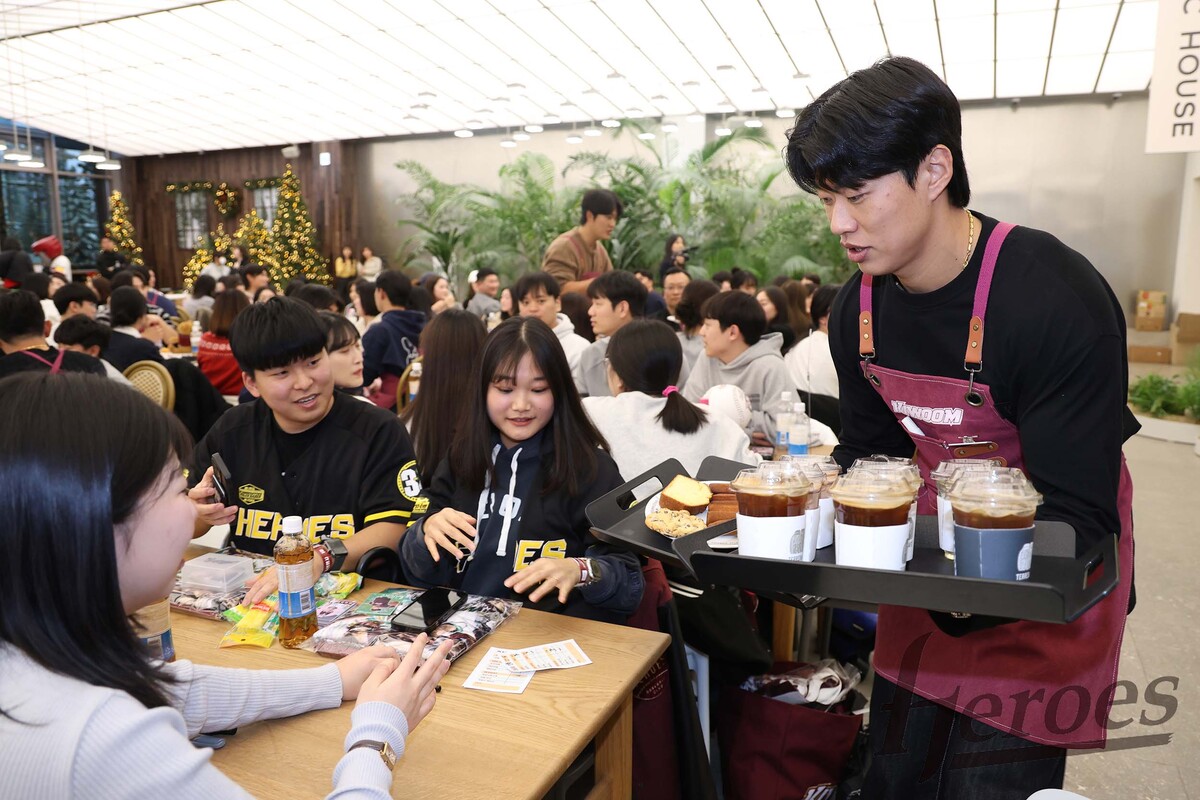 사진=키움히어로즈 제공 이어서 선수 47명이 참여한 자선행사가 열렸다. 1부에는 히어로즈 2025 연간회원 200명, 2부에는 사전 선발된 팬 200명이 함께했다. 자선카페의 형식으로 진행된 행사에서 송성문, 이주형, 김건희 등 선수들은 직접 주문을 받고 서빙을 하며 팬들과 더욱 가까이에서 소통했다. 선수단 애장품을 활용한 경매 순서는 팬들의 가장 큰 호응을 얻었다. 엔터히어로 1호로 활동한 박정화 배우는 게스트로 참여해 현장 분위기를 뜨겁게 만들었다. 선수들은 자선행사에 참여한 팬 전원에게 기념 담요를 선물하며 팬들의 사랑에 감사의 마음을 전했다. 이날 자선행사에서 발생한 수익금은 전액 기부할 예정이다.