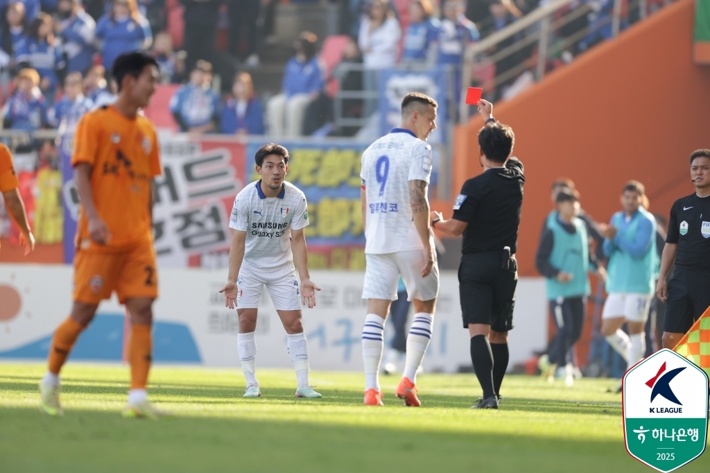 레드카드를 받는 수원 이기제. 사진=한국프로축구연맹 제공 수원 삼성이 K리그1 승격의 문턱에서 좌절했다.