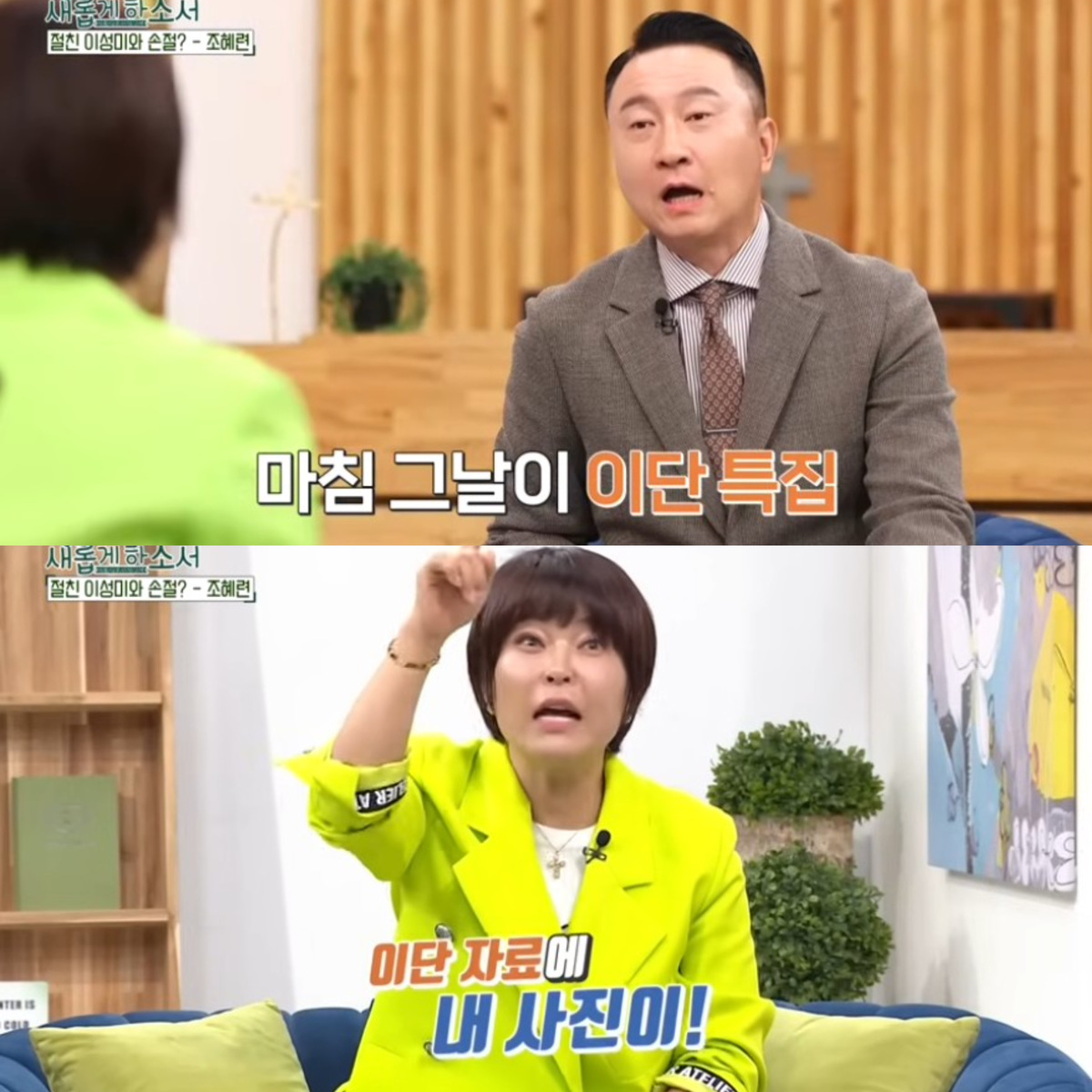 '이단 특집'에서 자료로 자신의 사진이 사용되었음에 분노한 조혜련. 유튜브 채널 '새롭게 하소서 CBS' 영상 캡처 그런데 그 날은 ‘이단 특집’이었다. 조혜련은 “이단 자료에 내 사진이 있었다. 그게 너무 싫었다”라면서 “근데 사실 내가 이단은 아니었다. 불교 쪽이었으니까”라고 당시를 회상했다. 이어 조혜련은 “이성미가 갑자기 강대상에 올라가더라. 그리고 ‘내가 계속 기도하던 혜련이 와 있어요. ’막 이러는 거다”라면서 “내가 ‘언니, 하지 마. 하지 마.’라고 했는데, 이성미가 ‘혜련아 일어나, 일어나.’ 하더라”고 말했다.