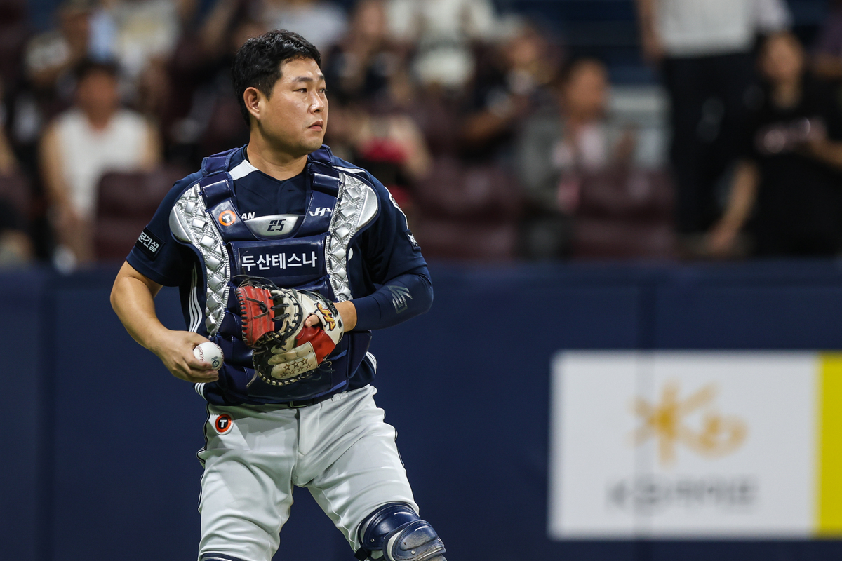 두산 양의지가 지난 8월8일 고척 키움전 도중 송구 자세를 취하고 있다. 사진=두산 베어스 제공 숫자 뒤에 숨은 철저한 준비와 태도가 더 큰 비중을 차지한다. 해마다 달라지는 몸 상태를 체크하며 루틴을 세밀하게 조정하고, 긴 시즌 컨디션이 크게 흔들리지 않도록 관리하는 것은 기본이다. 잘했다고 들뜨지 않고, 못했다고 끙끙대지 않는 마음가짐이 더해진다.