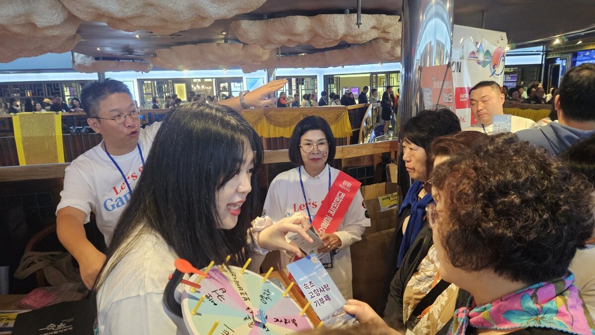엄윤순 강원도의회 농림수산위원장이 지난 6일 속초항을 출발한 크루즈 코스타 세레나호에서 탑승객을 대상으로 강원도 관광지를 홍보하고 있다. 도의회 제공 엄 위원장은 같은 날 오후 크루즈 탑승객을 대상으로 열린 '강원 방문의 해, 관광홍보 행사'에서 강원 관광지가 담긴 안내책자를 나눠주며 강원 관광지 곳곳을 홍보했다. 엄 위원장은 8일 홋카이도 부지사와 만나 강원도와 홋카이도 간 교류 협력 활성화 방안에 대해 논의했다. 오는 9일에는 쿠시로시에서 열리는 ‘한일 특별자치도 발전방안 세미나’에 참석해 축사를 할 예정이다.