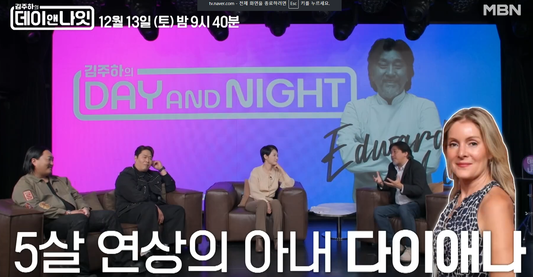 MBN '김주하의 데이앤나잇' 넷플릭스(Netflix) 예능 '흑백요리사'로 대중에 얼굴을 알린 한국계 미국인 셰프 에드워드 리(53)가 지금의 자리에 오르기까지 겪어온 인생사를 들려줄 예정이다. 오는 13일 오후 9시 40분 MBN에서 방송되는 '김주하의 데이앤나잇'에는 김주하, 코미디언 문세윤, 가수 조째즈가 셰프 에드워드 리와 만나 음식과 인생에 대한 다양한 대화를 나눈다.