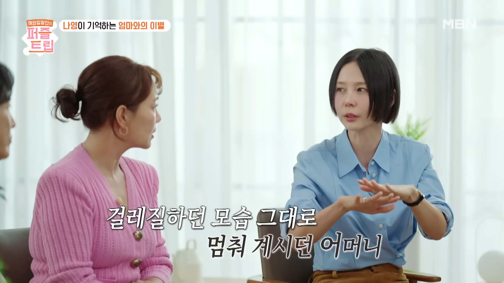 MBN ‘퍼즐트립’ 3부 방송화면 캡처 한국콘텐츠진흥원 2025 방송영상콘텐츠 공공 비드라마 부문 제작지원 선정작인 ‘퍼즐트립’은 해외 입양인이 한국을 방문, 가족과 정체성에 관련한 경험을 하는 과정을 관찰 형식으로 담은 프로그램이다. 방송에서 김나영은 24세의 해외 입양인 케이티를 집으로 초대, 직접 준비한 저녁을 대접하며 이야기를 나눴다. 그는 “엄마가 초등학교 입학 일주일 전에 돌아가셨다”고 회상했다.