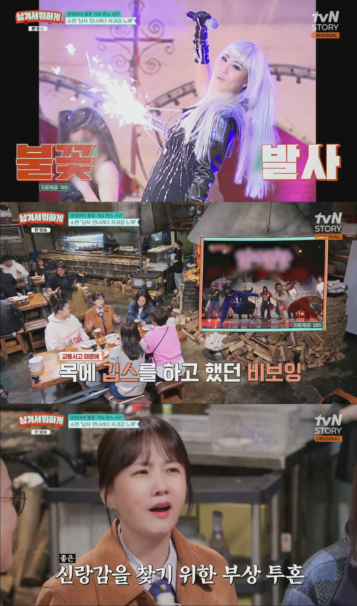 tvN STORY ‘남겨서 뭐하게’ 방송 화면 캡처 파격적인 퍼포먼스를 다시 떠올리며 예능 촬영의 강도도 언급했다. 박소현은 “어느 날 봤더니 그렇게 조언해 주던 정아가 가슴에 불을 달고 쇼를 하고 있더라”고 말해 웃음을 자아냈다. 이어 “나는 비보이를 했는데 그때 교통사고가 나서 목 깁스를 하고 췄다. 너무 힘들어서 울었다”고 당시의 육체적·감정적 소모를 전했다. 그는 “남자를 만나보겠다고 그 자리에서 그러고 있는 게 처량했다”며 웃었지만, 기억을 떠올리며 눈시울을 붉히기도 했다. 그가 당시 느꼈던 고민은 최근 데이팅 프로그램에서 밝힌 결혼관과도 이어진다.