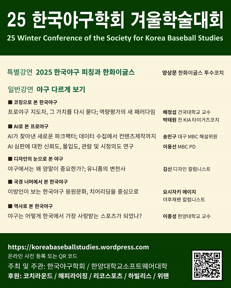 이번 학술대회에서는 ‘야구 다르게 보기’라는 주제로 전문가들의 강연이 진행된다. 프로야구 전·현직 지도자들이 직접 강단에 선다. 양상문 한화 투수 코치는 ‘2025년 한국 야구 피칭과 한화 이글스’라는 주제로 특별 강연을 한다.