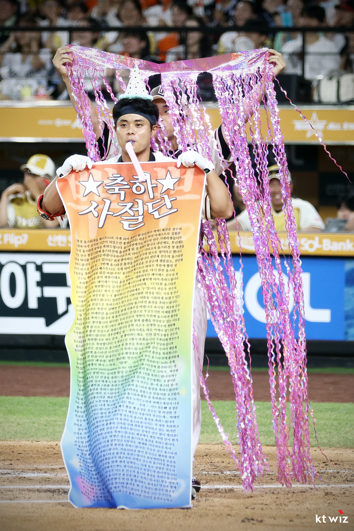 KT는 9일 수원 KT 위즈파크에서 두산과의 정규리그 맞대결을 치르고 있다. 이날 경기에 앞서 권동진이 팬들을 초청하는 등 의미 깊은 순간을 선물했다. 지난 7월 올스타전에서 “출전하게 되면 KT 팬들을 초청해 위즈파크 먹거리를 무제한으로 제공하겠다”는 공약을 내건 바 있다.
