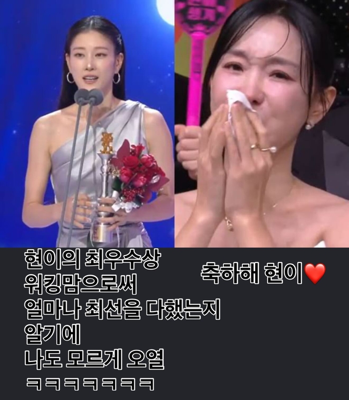 동료 이현이의 최우수상 수상 순간, 자기 일처럼 펑펑 울음을 터뜨린 비하인드도 공개됐다.