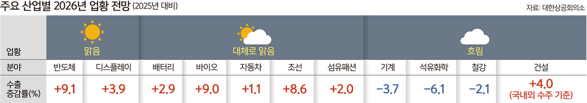글로벌 빅테크(거대기술기업)들의 인공지능(AI) 투자 확대에 힘입어 2026년에는 반도체, 디스플레이, 에너지저장장치(ESS) 관련 분야 성장이 두드러질 전망이다. 자동차, 조선, 바이오, 섬유패션 등도 호황이 예상되는 분야로 꼽힌다. 해당 분야 수출이 늘며 한국 경제 성장을 견인할 것으로 보인다.