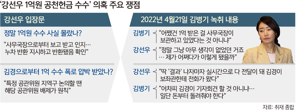 대여 공세 빌미를 쥔 국민의힘은 때를 놓치지 않을 태세다. 최수진 원내수석대변인은 “명확한 불법이 확인된 상황”이라며 “강 의원은 즉각 의원직을 사퇴하라”고 압박했다. 야당은 김 전 원내대표에 대한 신속한 수사 필요성도 촉구하며 공세 수위를 높이고 있다. 검사 출신 주진우 의원은 “1억원 받고 공천했는데 동료 국회의원으로서 부끄럽지 않나”라고 했다. 그는 “뇌물이 어지러울 정도로 판치는 민주당이야말로 ‘뇌란 정당’”이라고도 했다. 장동혁 대표도 속도감 있는 수사를 주문한 만큼 국민의힘은 특검 카드를 앞세워 압박을 이어갈 방침이다.