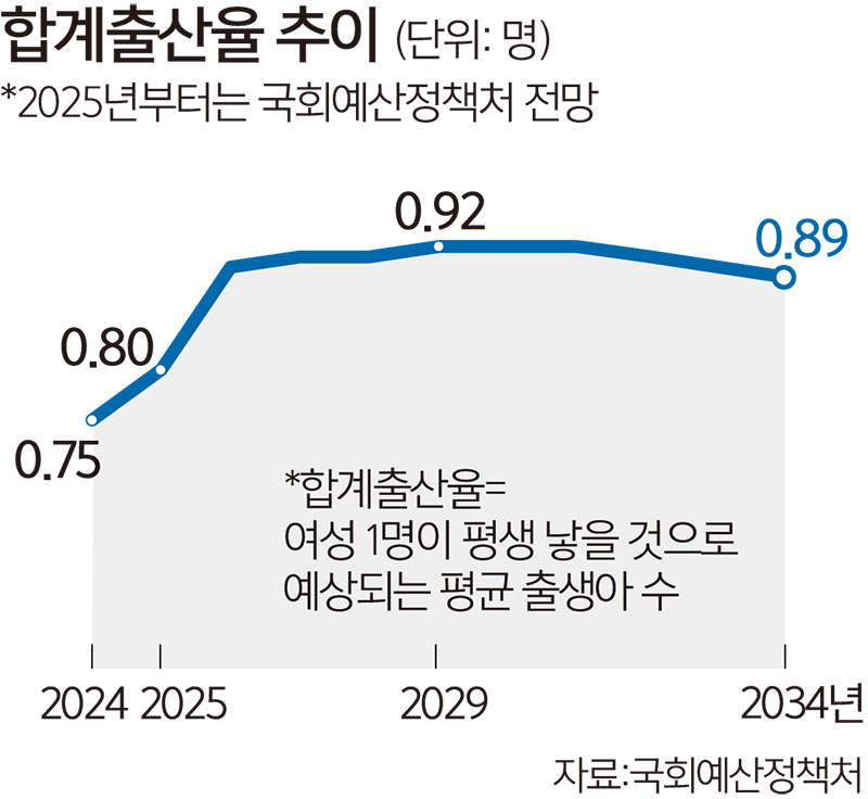 사진=연합뉴스 1일 국가데이터처에 따르면 지난해 10월 합계출산율은 0.81명으로 전년 동월보다 0.02명 늘었다. 지난해 합계출산율은 1~10월 평균 0.80명 수준이다. 지난해 연말까지 이런 추세가 이어졌을 가능성이 큰 만큼 2025년 합계출산율은 4년 만에 0.8명대를 기록할 것으로 예측된다. 합계출산율은 2021년 0.81명에서 2022년 0.78명, 2023년 0.72명으로 역대 최저 수준으로 떨어졌다. 이후 2024년 0.75명을 기록, 9년 만에 반등에 성공했다. 올해에도 출생아 반등세는 계속될 것이란 분석이다. 국회예산정책처가 최근 발표한 ‘인구전망:2025~2045’를 보면 합계출산율은 올해 0.90명으로 단기 반등한 후 2030년 점진적으로 증가세가 지속된 뒤 2045년 0.92명을 기록할 것으로 예측됐다. 코로나19 사태로 지연됐던 혼인이 증가하면서 합계출산율이 올해 큰 폭으로 상승한 뒤 장기적으로 0.90명 안팎에서 형성될 가능성이 크다는 것이다.