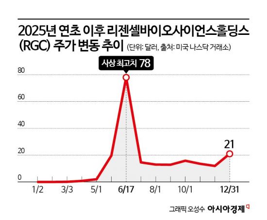 2025년 미국 나스닥 시장에서 가장 높은 주가 상승률을 보인 종목은 1만6000% 이상 급등한 홍콩 제약사 리젠셀바이오사이언스홀딩스(RGC)다. 연간 상승률이 가장 높은 종목이었지만, 2021년 나스닥 상장 이후 현재까지 등록된 신약과 매출이 전무해 주가조작 의혹이 커졌고, 미국 규제당국도 조사에 들어갔다. 향후 대규모 소송이 예고돼 주가 변동성은 더욱 커질 것으로 우려되고 있다.