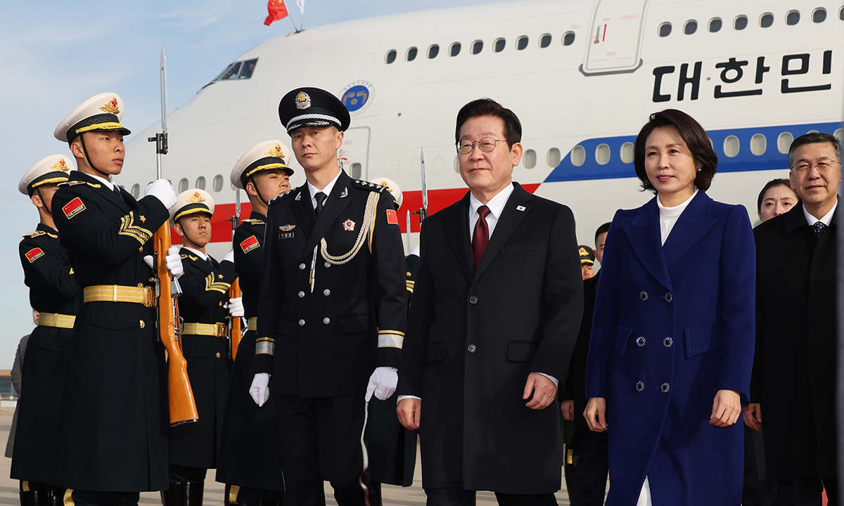 中 베이징 도착 이재명 대통령과 김혜경 여사가 4일 베이징 서우두공항에 도착한 공군1호기에서 내려 중국군 의장대의 사열을 받으며 이동하고 있다. 이 대통령 내외는 이날부터 3박4일간 중국을 국빈 방문한다. 베이징=뉴스1 이 대통령은 6일에는 중국 국회의장격인 자오러지 전국인민대표대회 상무위원장을 면담하고, 이어서 중국의 ‘경제사령탑’인 리창 총리와 만나 오찬을 함께할 예정이다. 위 실장은 “자오 위원장과는 한·중 양국 간 우호 정서 증진을 위해 머리를 맞대고, 리 총리와는 한·중 양국이 시대의 변화에 맞춰 수평적 협력에 기초한 새로운 경제협력 모델을 만들어 나가는 데 대해 의견 나눌 것”이라고 말했다. 베이징=박영준 기자 yjp@segye.com