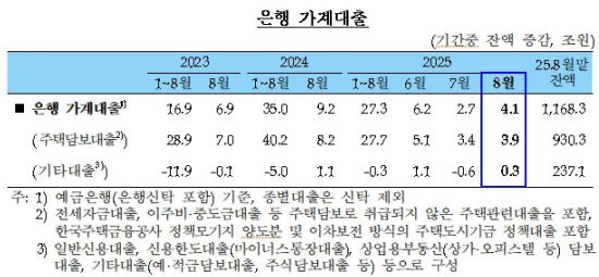 10일 한국은행이 발표한 '2025년 8월 중 금융시장 동향'에 따르면 지난달 말 은행 가계대출 잔액은 1168조3000억원으로 전월 말 대비 4조1000억원 증가했다. 전월(2조7000억원) 대비 증가 규모가 상당폭 확대됐다.