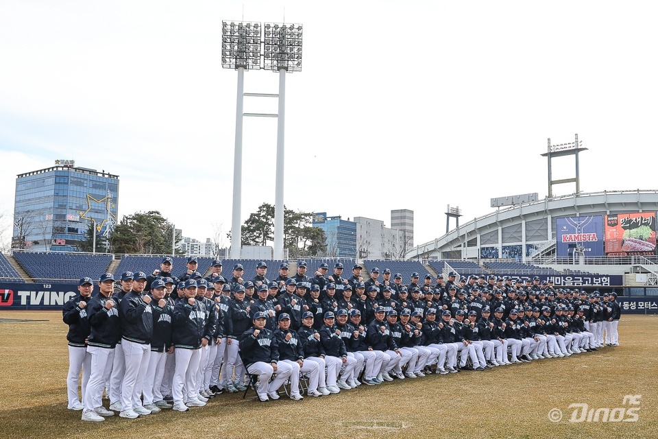 NC 선수단 및 코칭스태프가 5일 창원NC파크에 모여 2026시즌 각오를 다지며 기념촬영을 하고 있다. 사진=NC다이노스 제공 이진만 대표이사는 “지난해 NC는 투지와 근성, 그리고 강한 팀워크로 무장해 시즌 막판 10연승과 함께 기적 같은 스토리북 엔딩을 써나가며 야구계에 진한 감동을 선사했다”며 “험난한 과정을 극복해가며 자신감이라는 중요한 가치를 더 장착할 수 있었다”고 지난해를 돌아봤다.