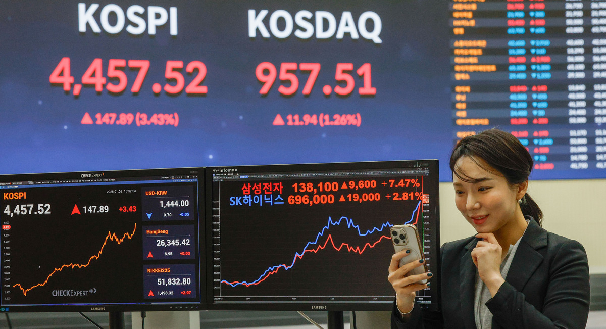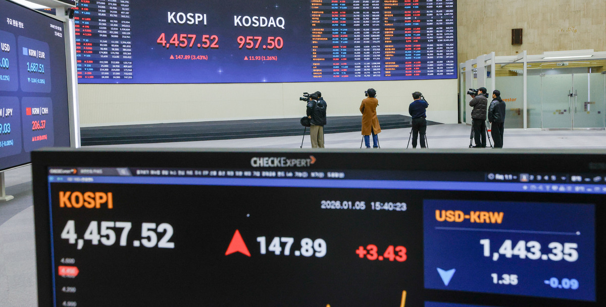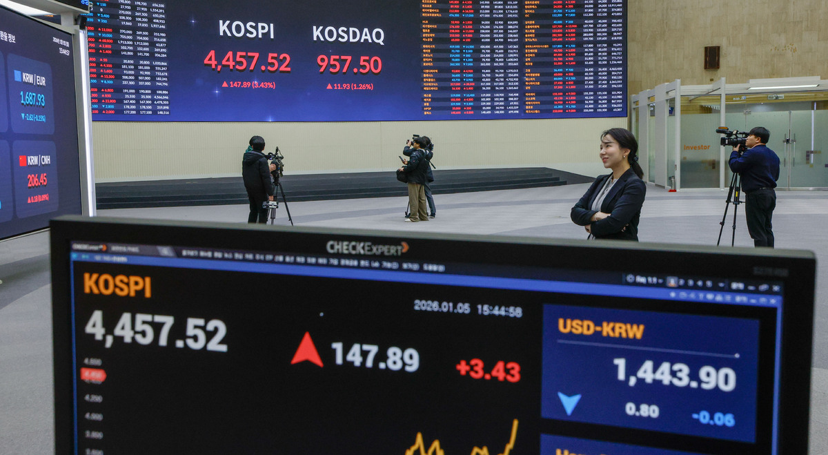 코스피가 5일 지난 주말 베네수엘라 사태에도 불구하고 대형 반도체주 강세에 힘입어 역대 처음 4,400선을 돌파했다. 이날 코스피는 전장보다 147.89포인트(3.43%) 오른 4,457.52에 장을 마치며 직전 거래일(2일) 기록한 종가 기준 사상 최고치(4,309.63)를 하루 만에 경신했다.