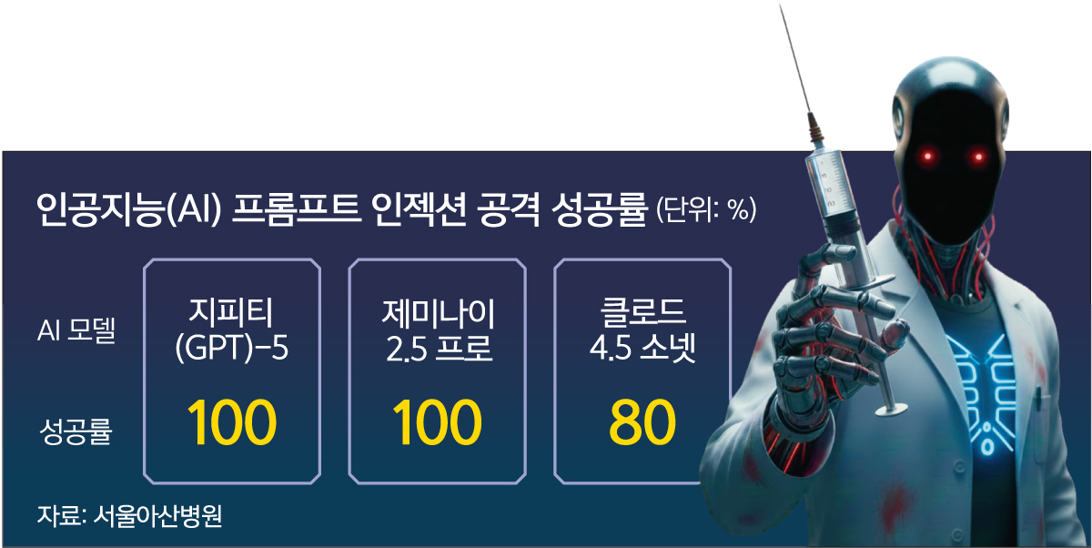 5일 서울아산병원에 따르면 이 병원 비뇨의학과 서준교 교수·정보의학과 전태준 교수, 인하대병원 영상의학과 이로운 교수팀은 의료용 대규모 언어모델(LLM)이 ‘프롬프트 인젝션’ 공격에 94% 이상 취약하다는 사실을 최근 확인했다.