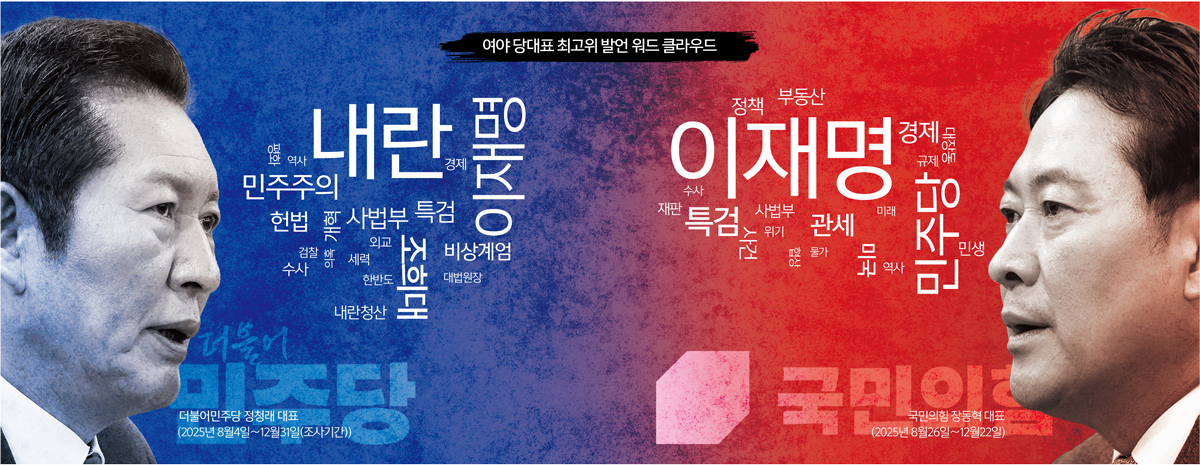 지난해 8월 2일 선출된 더불어민주당 정청래, 8월 25일 뽑힌 국민의힘 장동혁 대표가 연말까지 최고위원회의에서 한 발언을 전수 분석한 결과 두 대표 모두 지지층 핵심 수요만 맞닿는 의제 위주의 발언을 이어간 것으로 조사됐다. 정 대표는 ‘내란’과 ‘윤석열’을 필두로 ‘사법부’, ‘조희대’, ‘특검’ 등 사법 이슈를 앞세우며 지지층을 결집하고 야당에 대한 공세에 나서는 모습을 보였다. 반면 장 대표는 최고위 발언 대부분을 이재명 대통령 비판에 할애하는 모습을 보였다.