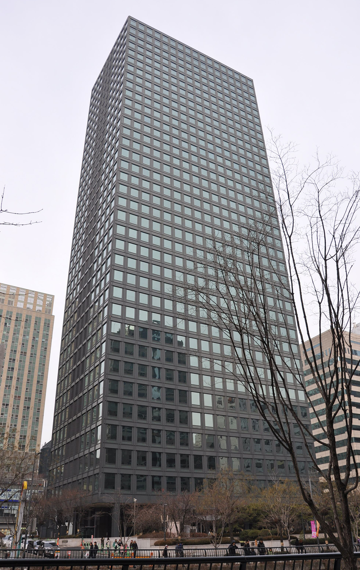 청계천 방향으로 난 건물의 부출입구와 계단 중앙에 놓인 거북이 머리. 서울역사박물관, 남산 힐튼호텔, 경주 우양미술관 등 김종성이 설계한 건축물 중 SK서린빌딩은 고층 업무시설이라는 점 때문에 스승의 건축언어가 가장 충실하게 드러나 있다. 김종성 자신도 미시안 스타일의 원조격인 뉴욕의 시그램빌딩(1958, Seagram Building)이 SK서린빌딩의 원형이라고 인정했다. 동시에 40년이라는 시간 동안 발전한 커튼월 기술과 공조시스템을 적용했다. SK서린빌딩은 1999년에 지어진 ‘한국의 시그램빌딩’인 셈이다. 미시안 스타일의 대표적인 특징이라 할 수 있는 불필요한 장식이 없는 매끈한 외관은 ‘격자 튜브 시스템’을 통해 구현됐다. 또한 이를 통해 건물에 수평으로 작용하는 힘(횡력)에 저항하며 경제성까지 확보할 수 있었다고 한다. 흥미로운 건 견고함 속 가벼움이다. 사용자들과 주변 보행자들이 주로 마주하는 1층 입면은 투명한 유리로 처리해 모더니즘 건축이 추구한 투명하고 가벼운 공간을 표현하고 있다. 그리고 외팔보(캔틸레버) 구조를 통해 종로와 청계천을 연결하는 1층 동서쪽 부분을 건물 외벽에서 3m 정도 뒤로 밀었다.