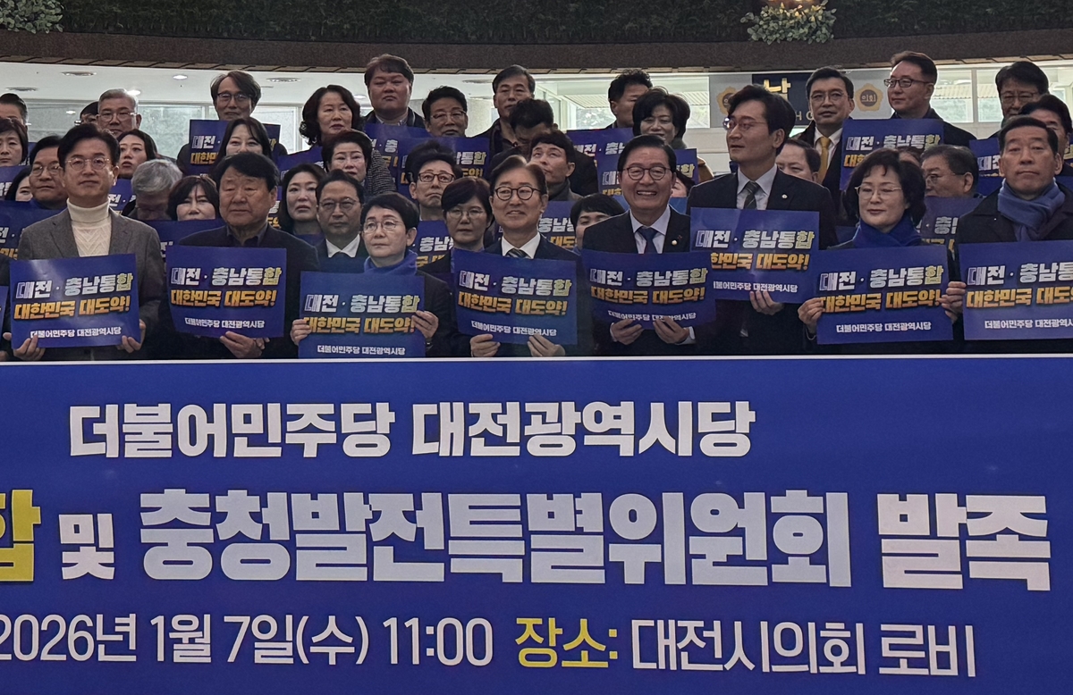 더불어민주당 대전시당 관계자들이 7일 대전시의회 로비에서 ‘대전충남통합 및 충청 발전특별위원회’ 발족 기자회견을 열고 있다. 강은선 기자 민주당 대전시당 특위는 이날 오전 대전시의회 로비에서 연 기자회견에서 “대한민국의 성장 방식을 다시 설계하는 ‘구조의 전환’이 필요하다”며 “이재명 정부의 국가 균형성장 전략인 ‘5극 3특’을 현실로 만들겠다”고 말했다. 이어 “지금 필요한 것은 중앙에 기대는 방식이 아니라 지역이 스스로 미래를 설계하고 성장을 견인하는 강력한 엔진을 장착하는 것”며 “단순한 선언에 그치지 않고 실천으로 증명하겠다”고 강조했다. 대전시당 특위는 대전의 첨단 과학과 충남의 제조기반을 결합해 경제 토대를 구축하고, 광역철도와 도로망을 확충해 대전·충남을 1시간 생활권으로 연결하겠다고 약속했다.