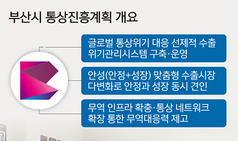 부산, 글로벌 통상 허브도시 발돋움 13개 기관 합동 통상대책 ‘원팀’ 가동 긴급자금 등 신속한 대응체계 구축 3대 분야 12개 과제 통상계획 마련 美·中·日 등에 해외무역사무소 설치 바이어 상담 등 현지 밀착형 서비스 러·중앙亞 등 신규시장 개척 노력도 인도 홍보관 설치 진출거점 확보 500억 규모 ‘환율케어자금’ 신설