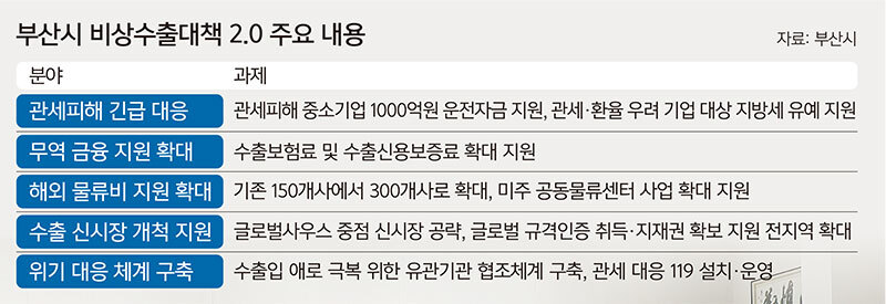 부산시는 이 같은 변화의 파고 속에서 ‘글로벌 통상 허브도시’로 도약하기 위해 △글로벌 수출위기관리시스템 운영 △맞춤형 수출시장 다변화 △무역 기반시설 확충 및 통상 네트워크 강화 3대 분야 12개 과제를 수립해 지역 중소기업이 해외시장으로 진출할 수 있도록 지원하고 있다. ‘비상수출대책 2.0’을 중심으로 한 관세 피해 중소기업 긴급운전자금, 수출 바우처, 해외 물류비, 공동물류센터 등이 대표적인 기업 맞춤형 지원이다.