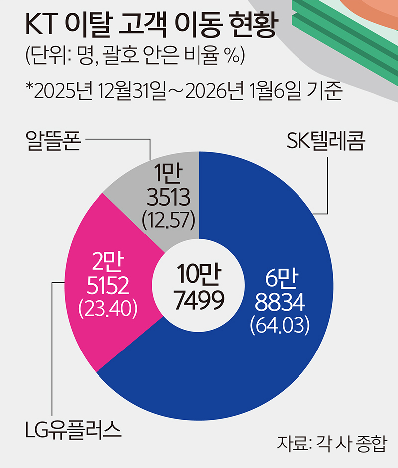 7일 정보통신기술(ICT) 업계에 따르면 지난해 12월31일부터 전날까지 10만7499명이 KT를 떠났다. 이탈 고객 6만8834명(64.03%)이 SK텔레콤으로 향했고, LG유플러스 2만5152명(23.40%), 알뜰폰은 1만3513명(12.57%)으로 집계됐다. 전날 KT 이탈 고객은 2만8444명으로 하루 최대치를 기록했다. 일요일 개통분이 반영된 5일 수치를 뛰어넘으면서 고객들의 통신사 이동이 본격화했다는 분석이 나온다.