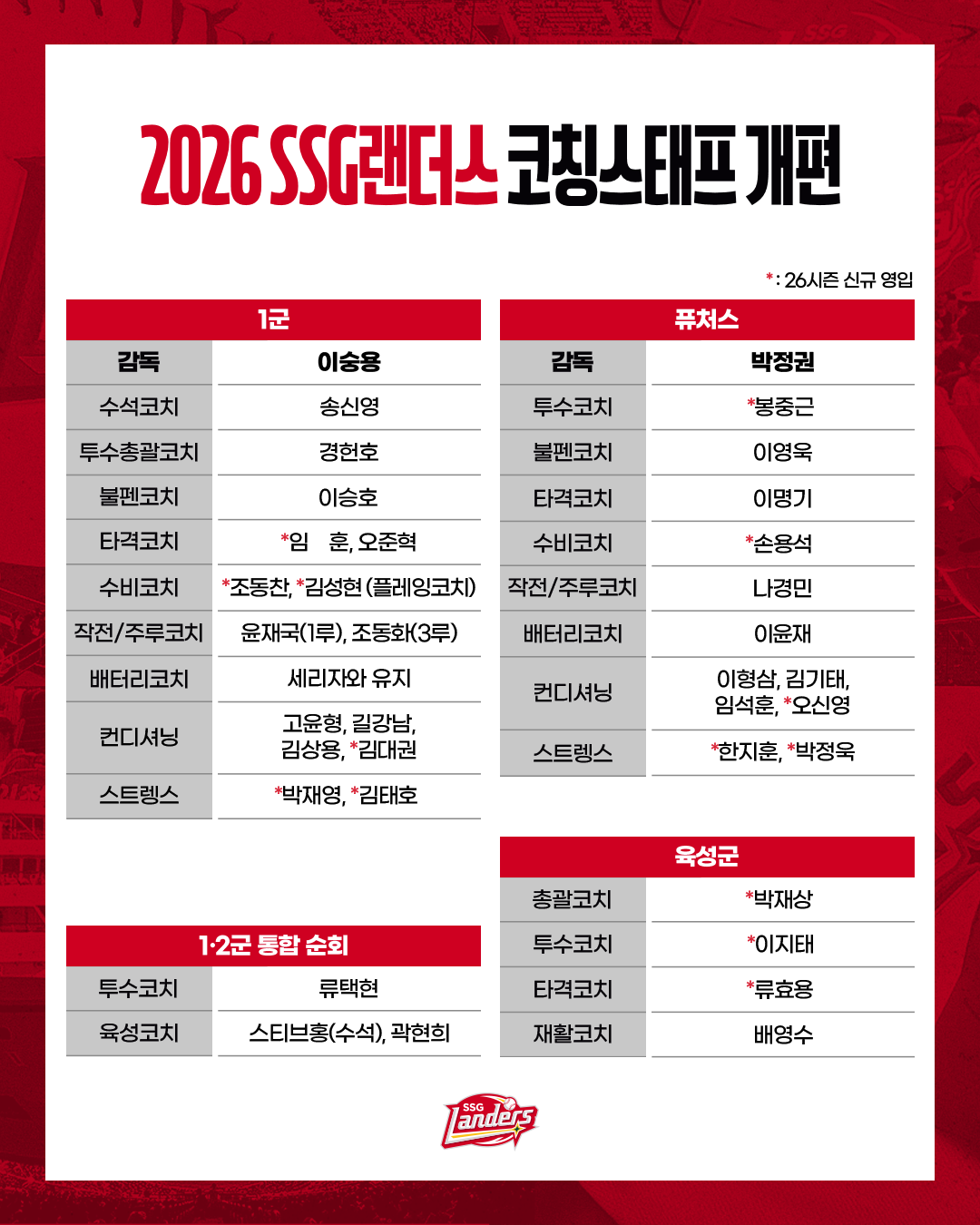 사진=SSG랜더스 제공 “확실한 방향성을!” 프로야구 SSG가 2026시즌 코칭스태프를 재정비했다. 변화가 엿보인다. 가장 눈에 띄는 부분은 경헌호 투수 총괄코치 체제로 전환되는 점이다. 앞으로 경 코치는 1, 2군 투수파트 소통을 총괄하고 선수 운영에 대한 폭넓은 의사결정을 할 수 있게 됐다. 과거 SSG가 육성 총괄을 선임한 적은 있지만 투수 쪽에 적용하는 것은 이번이 처음이다. SSG는 “이번 개편은 투수 파트의 연속성과 방향성을 분명히 하고, 청라돔 시대를 대비하기 위한 방안”이라고 설명했다.